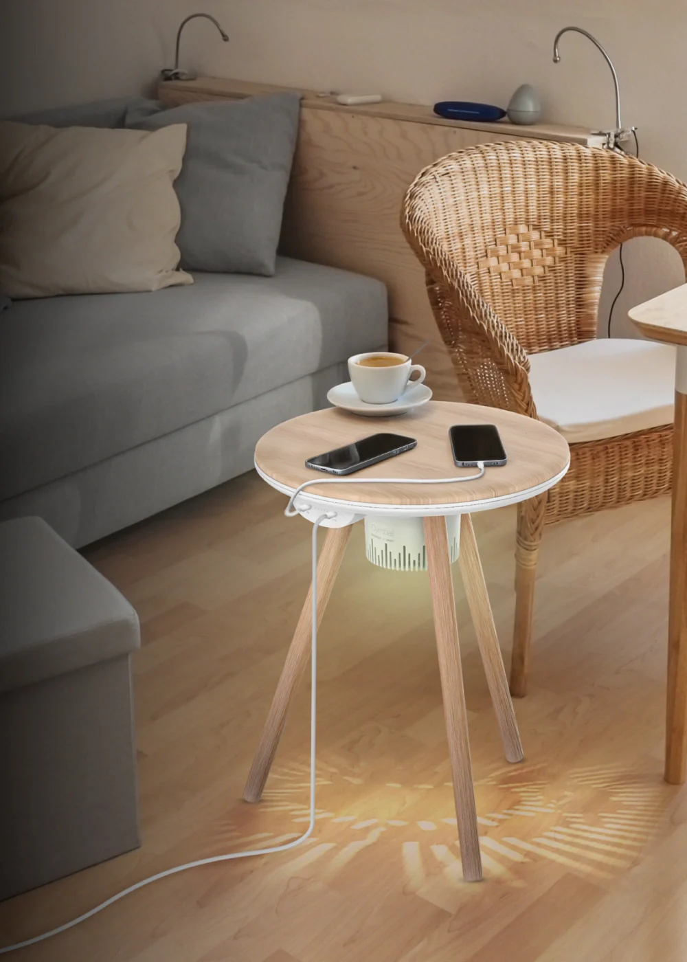 تم تطويرها بالتعاون مع استوديو التصميم 100°C في هونغ كونغ، وتجمع هذه الطاولة المبتكرة بين الشحن اللاسلكي، الإضاءة المحيطية، وإمكانيات الصوت اللاسلكي في تصميم موفر للمساحة.