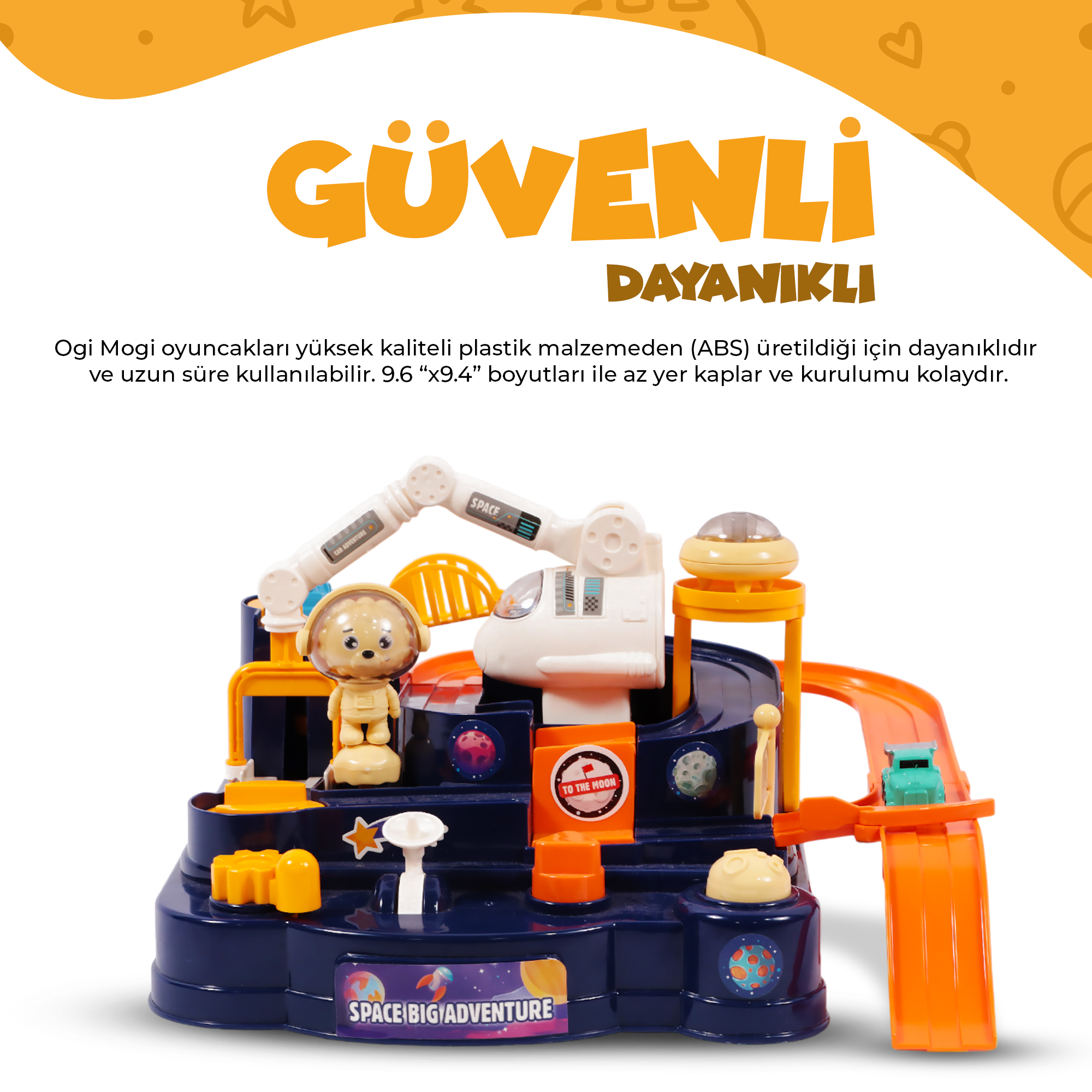 SPACE ADVENTURE PLAY SET: Ogi Mogi Toys Space Adventure Play Set consists of 1 astronaut, 1 flying saucer, 2 cars and race tracks with slide. 4 routing buttons and 7 check points make the game more fun. All parts are made of reliable materials, prioritizing children's health.