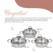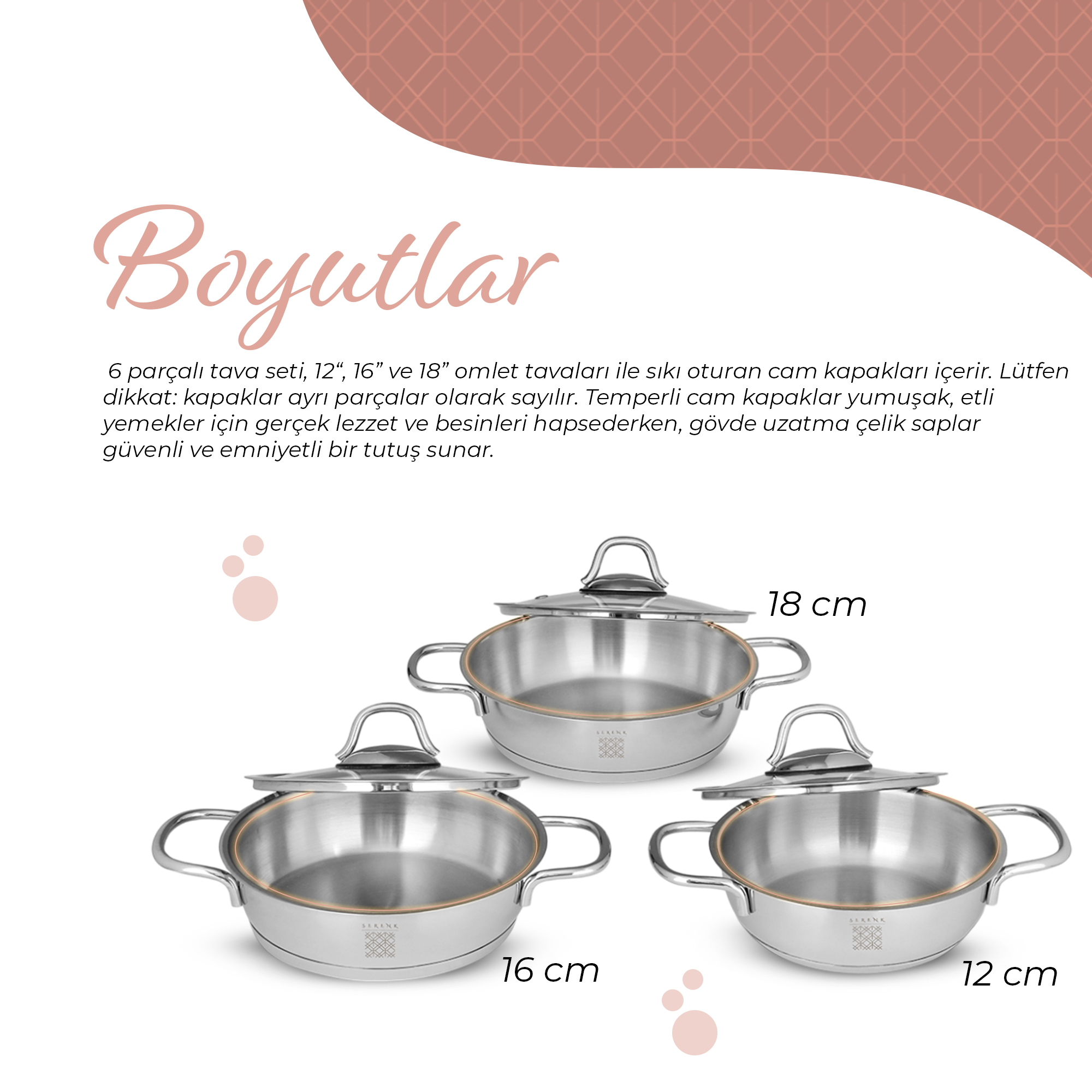 The Serenk Definition series 6-piece stainless steel frying pan set offers long-lasting use with its durable 18/10 stainless steel construction. Made from 304 grade stainless steel, this set provides excellent resistance to moisture and corrosion. The set includes three different sizes of frying pans with glass lids: 14 cm, 16 cm, and 18 cm, offering practical and versatile use in the kitchen.