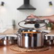 The cookware’s polished stainless steel surface provides a mirror-like finish, adding a sophisticated touch to your kitchen. Ergonomic stainless steel handles ensure a comfortable grip and a seamless, stylish design.