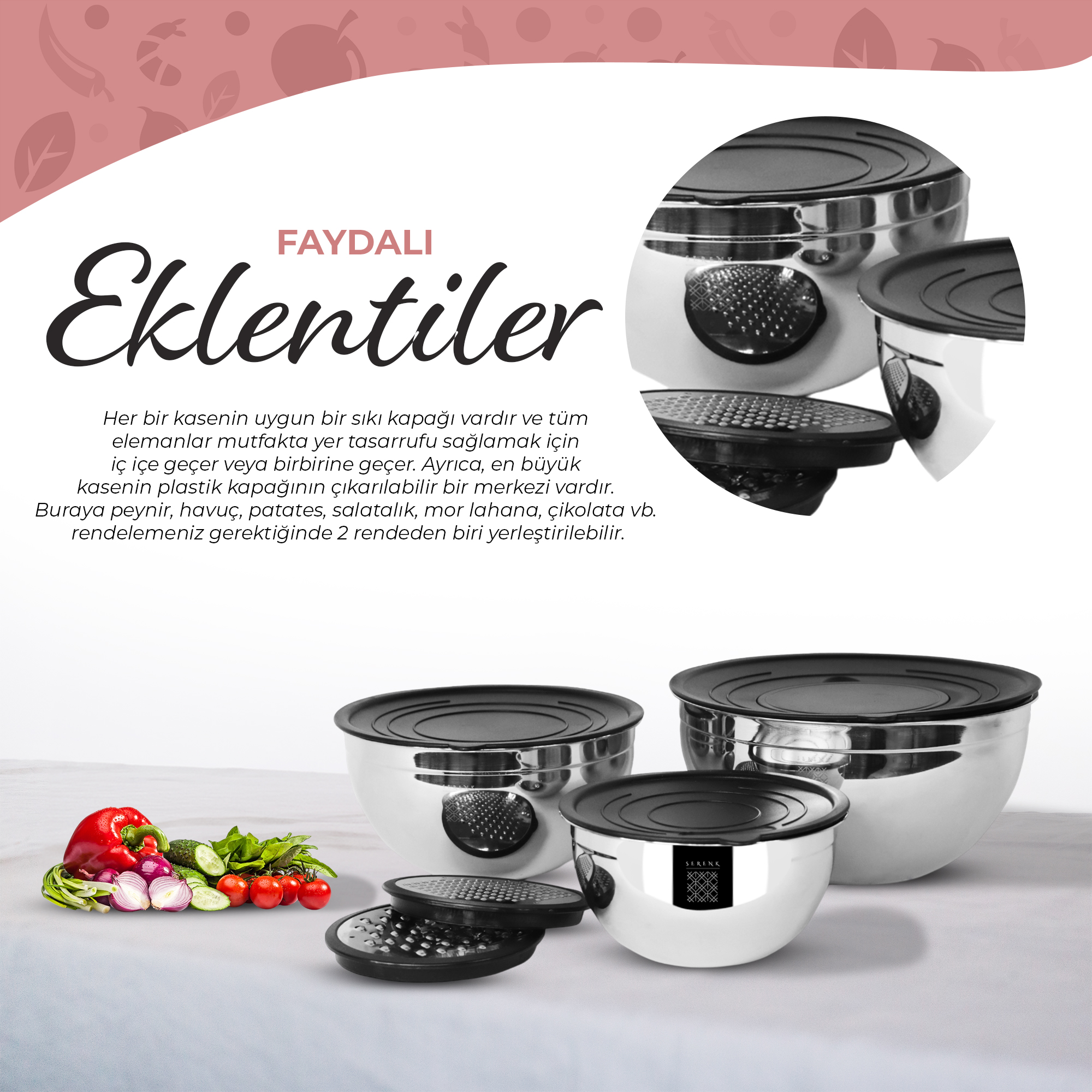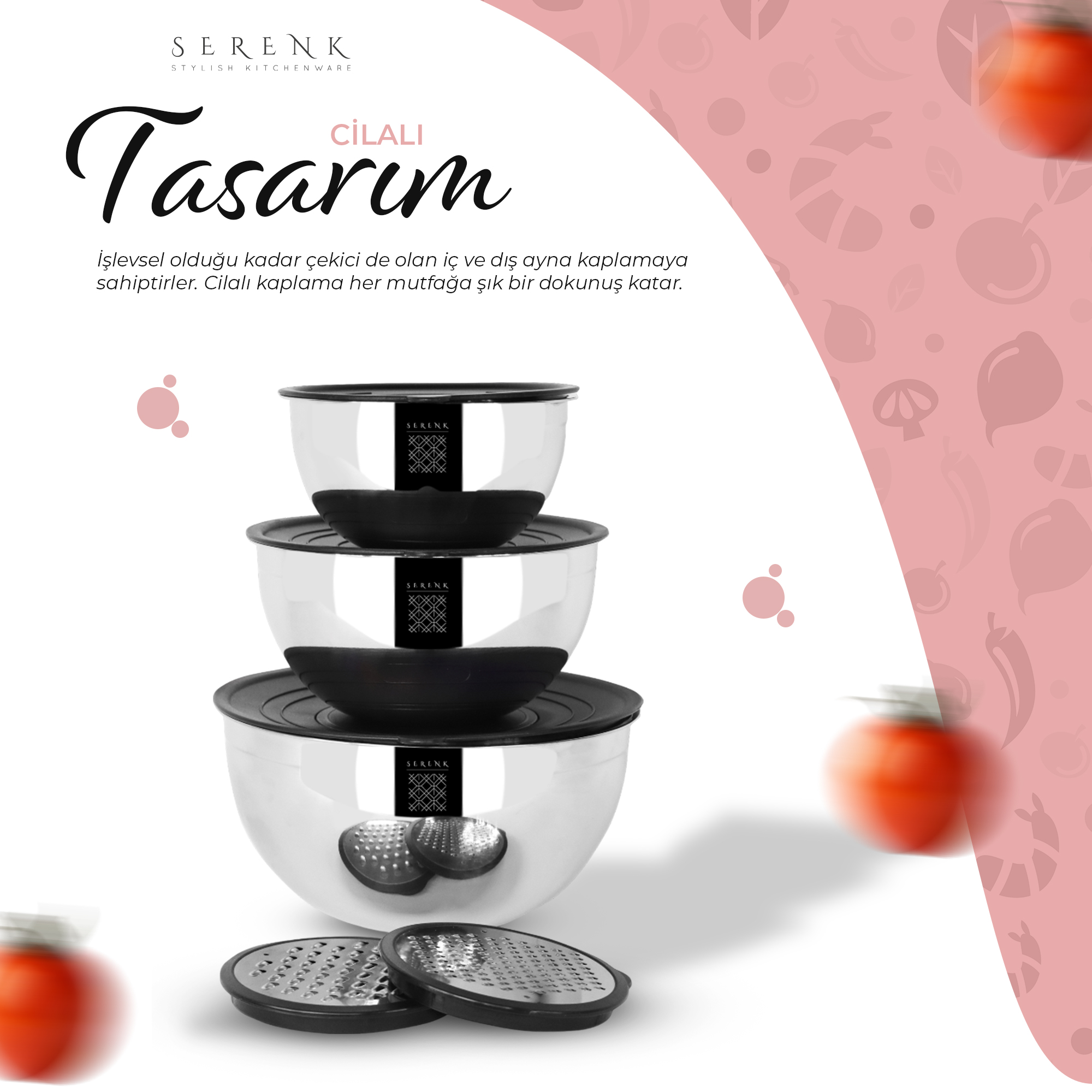 The Serenk Modernist Mixing and Storage Set is designed with both aesthetics and functionality in mind to meet all your kitchen needs. This versatile set includes three stainless steel mixing bowls, three food-safe plastic lids, one perforated lid, and two graters with fine and wide holes. With this all-in-one design, you can measure, mix, pour, store, and serve your food effortlessly.