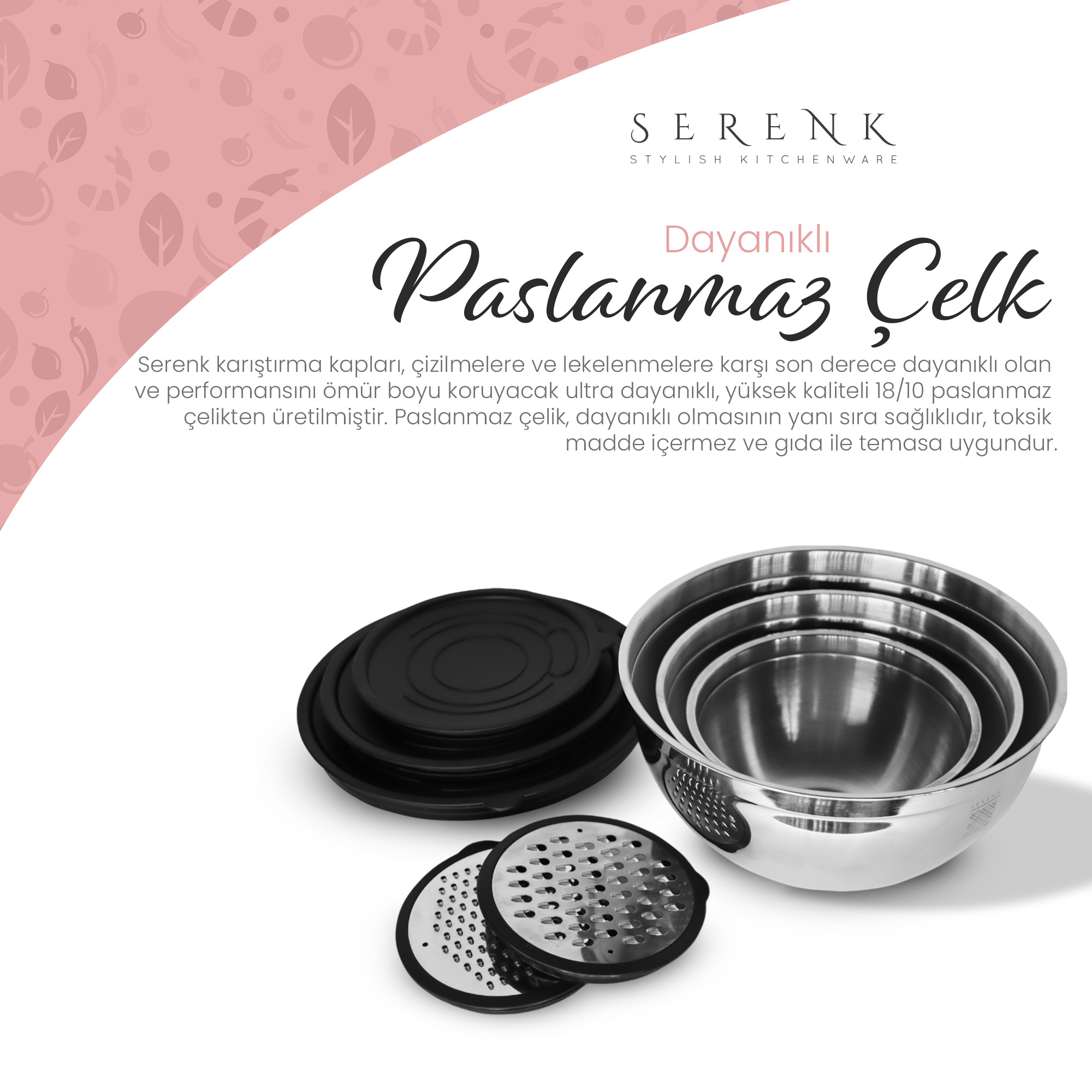 The Serenk Modernist Mixing and Storage Set is ideal for various kitchen tasks such as preparing meals, mixing dough, making salads, and storing food. The largest bowl’s plastic lid features a removable grater slot, allowing you to grate cheese, carrots, cucumbers, chocolate, and more directly into the bowl with ease.