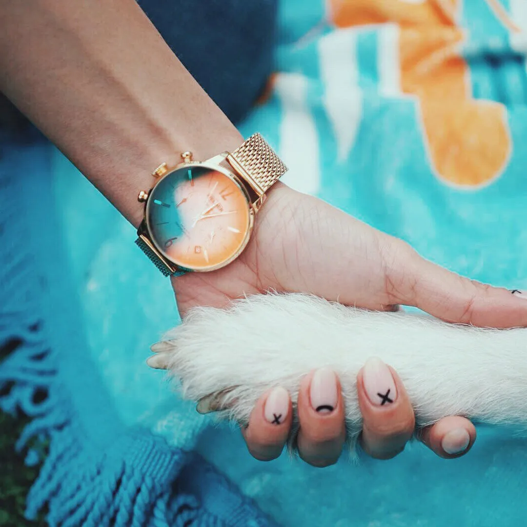 Features: Case Diameter: 38 mm Case Shape: Round Case Stone: No Glass Feature: Mineral Photochromic Style: Sports Watches Case Color: Gold Dial Color: Green Dial Stone: No Strap Type: Mesh Color: Gold Water Resistance: 5 ATM Stopwatch: No Calendar: Yes Alarm: No