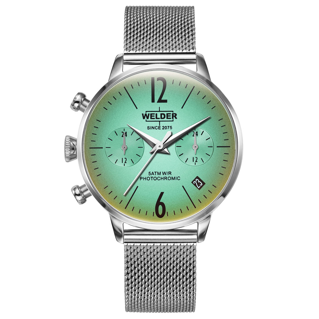 Features: Case Diameter: 36 mmCase Shape: RoundCase Stone: None>Glass Feature: Mineral PhotochromicStyle: Sports WatchesCase Color: Metallic GrayDial Color: Metallic GrayDial Stone: NoneStrap Type: MeshColor: Metallic GrayWater Resistance: Stopwatch: NoCalendar: YesAlarm: None