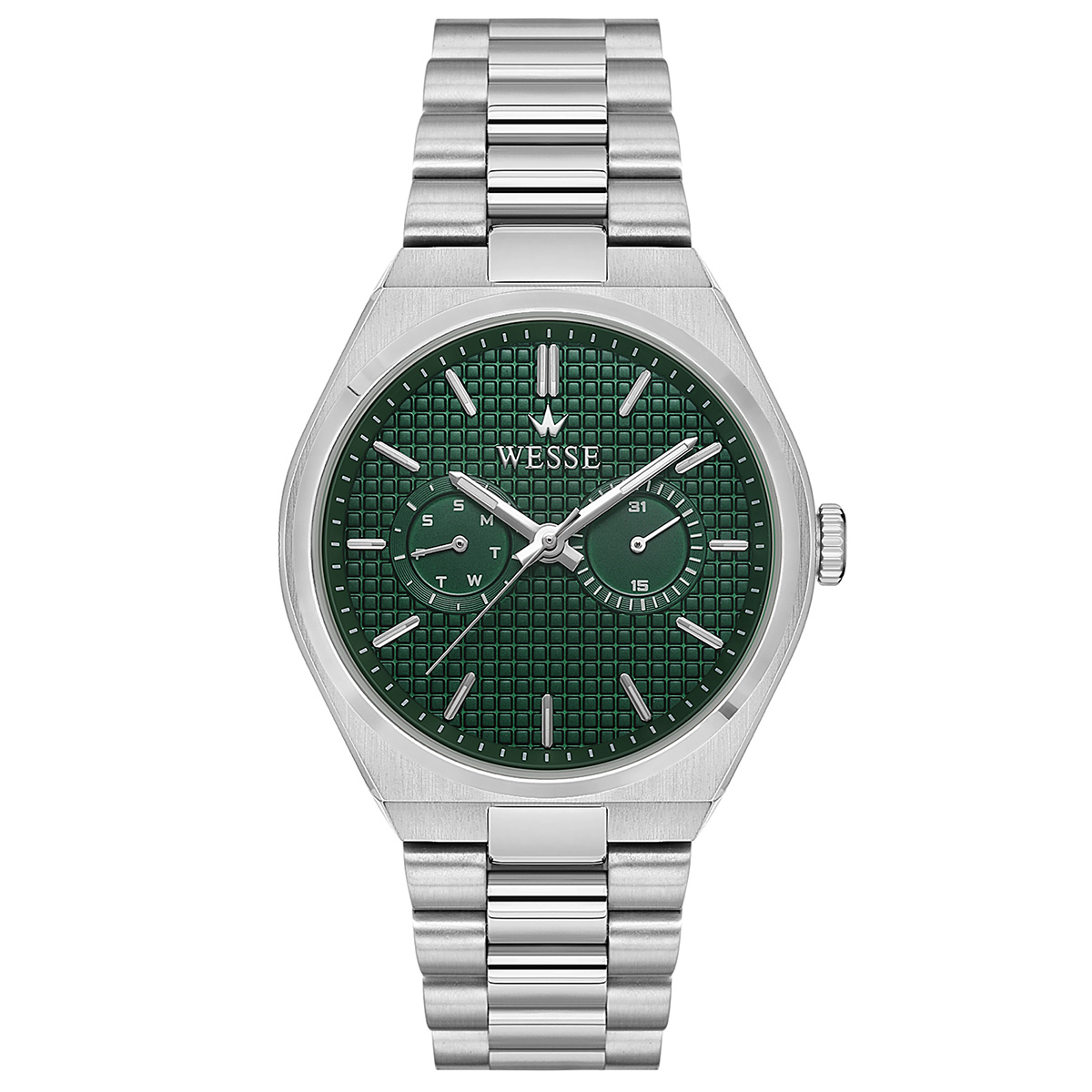 Features: Case Diameter: 42 mmCase Shape: RoundCase Stone: None>Glass Feature: MineralStyle: Classic WatchesCase Color: Metallic GrayDial Color: Metallic GrayDial Stone: NoneStrap Type: SteelColor: Metallic GrayWater Resistance: Chronometer: NoneCalendar: YesAlarm: None
