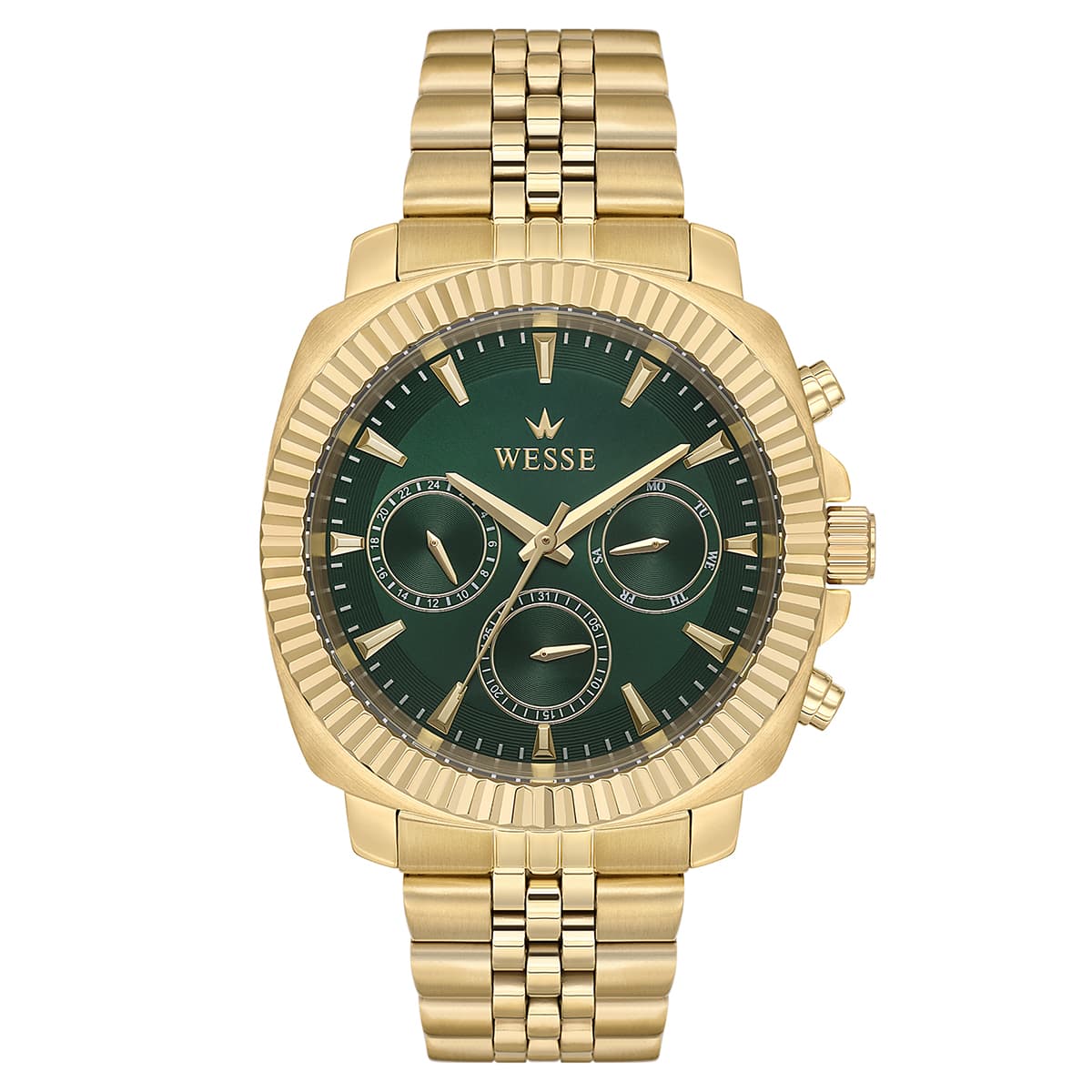 Features: Case Diameter: 42 mmCase Shape: RoundCase Stone: None>Glass Feature: MineralStyle: Classic WatchesCase Color: Gold ColorDial Color: Gold ColorDial Stone: NoneStrap Type: SteelColor: Gold ColorWater Resistance: Chronometer: NoCalendar: YesAlarm: None