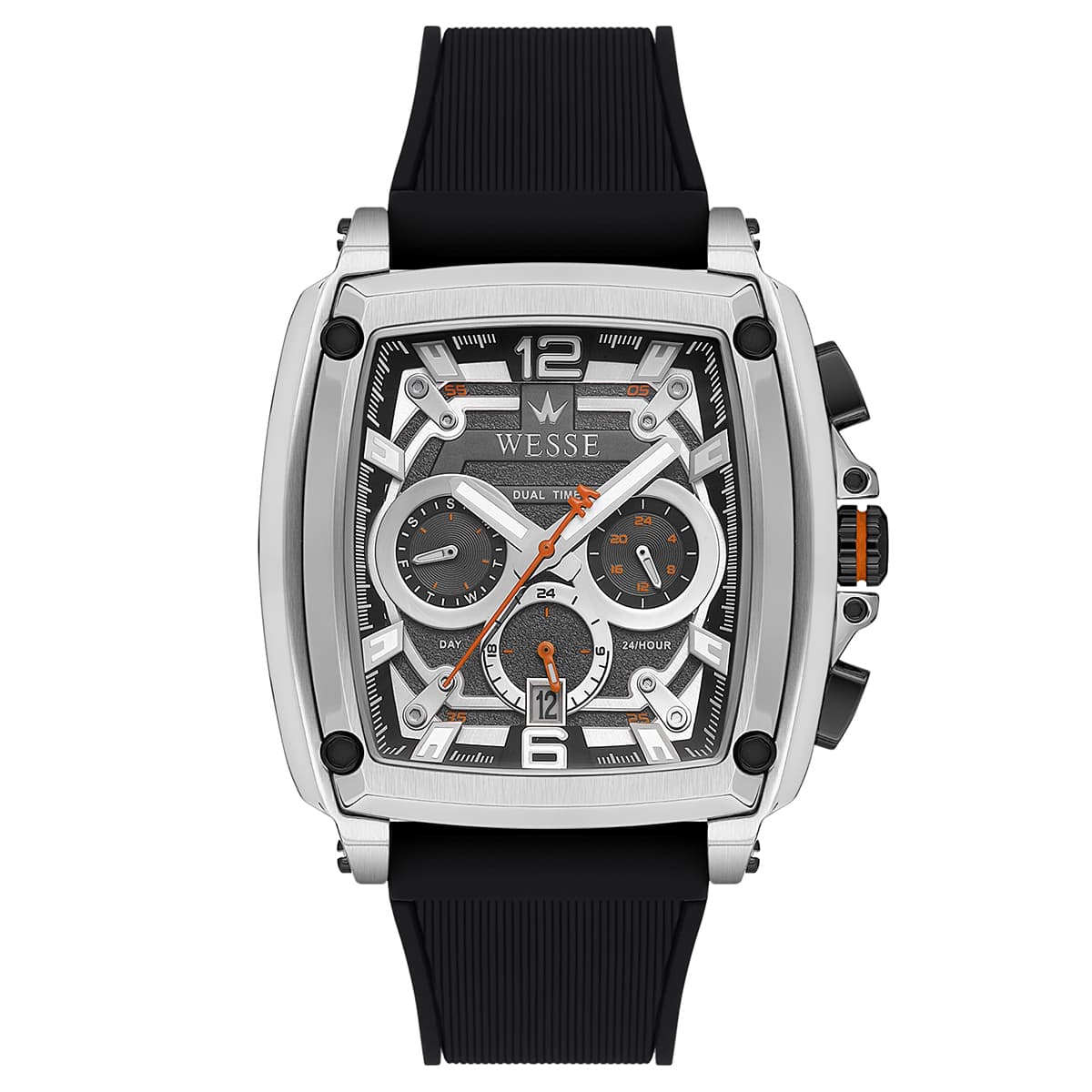 Features: Case Diameter: 44 mmCase Shape: SquareCase Stone: None >Glass Feature: MineralStyle: Sports WatchesCase Color: Metallic GrayDial Color: BlackDial Stone: NoneStrap Type: SiliconeColor: BlackWater Resistance: Stopwatch: NoneCalendar: YesAlarm: None