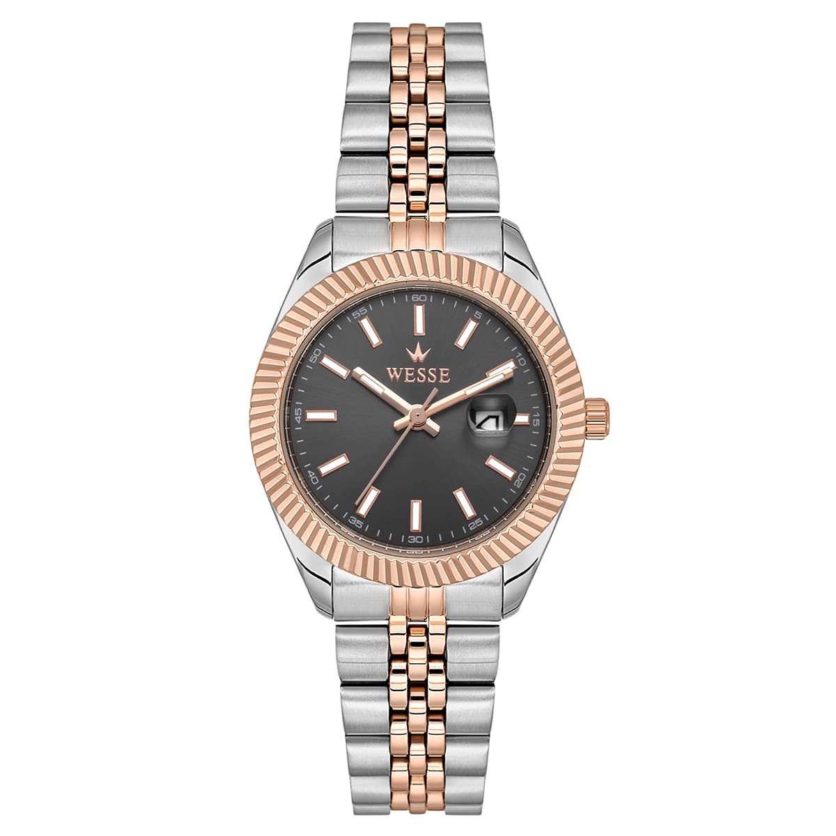 Features: Case Diameter: 32 mmCase Shape: RoundCase Stone: None>Glass Feature: MineralStyle: Classic WatchesCase Color: Metallic GrayDial Color: Rose Gold/Metallic GrayDial Stone: NoneStrap Type: SteelColor: Rose Gold/Metallic GrayWater Resistance: Chronometer: NoCalendar: YesAlarm: None