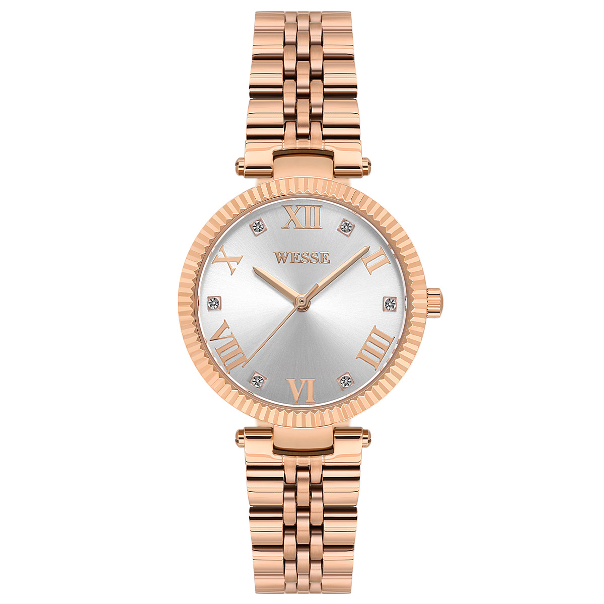 Features: Case Diameter: 33 mmCase Shape: RoundCase Stone: None>Glass Feature: MineralStyle: Classic WatchesCase Color: Rose GoldDial Color: Rose GoldDial Stone: YesStrap Type: SteelColor: Rose GoldWater Resistance: Chronometer: NoneCalendar: NoneAlarm: None