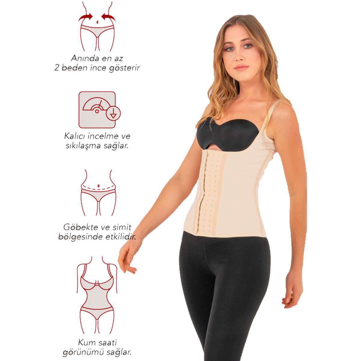 Premium Skin with Straps contains 7 steel bones that allow you to improve and correct your posture. This Waist Trainer can be used by anyone and is also suitable for postpartum. With regular use, the corset has an effect on belly, waist and abdomen areas of the body. It also provides permanent slimming and tightening.